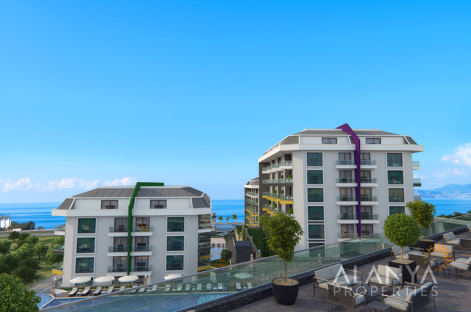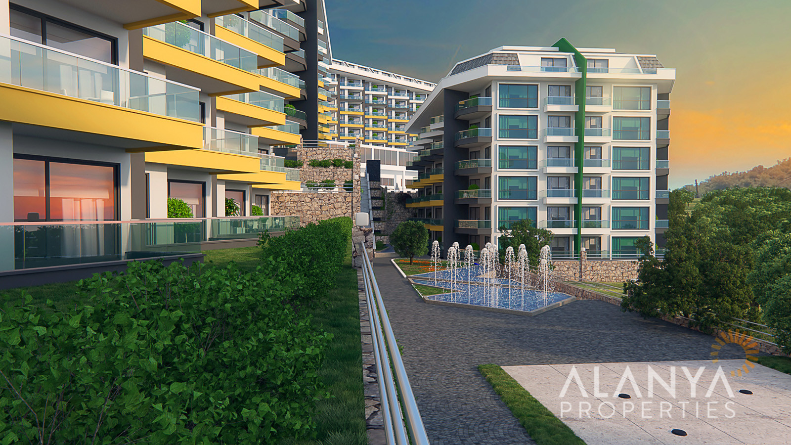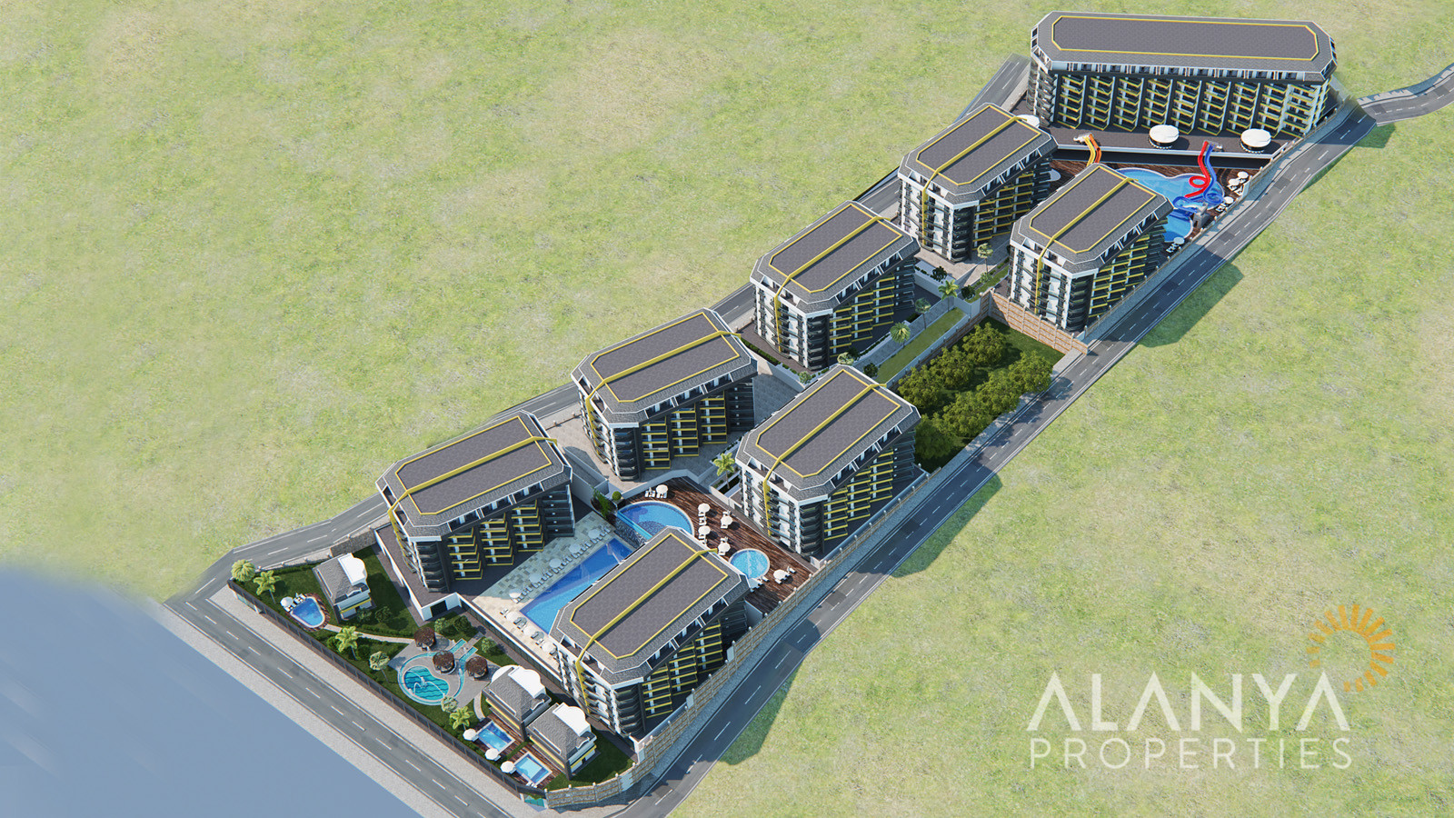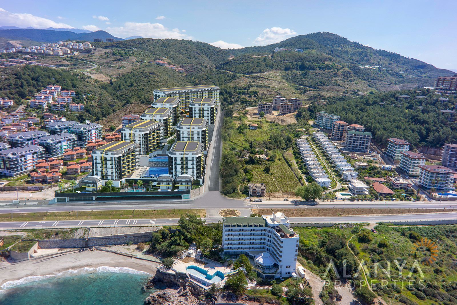 Appartements Vue Mer à Vendre à Kargicak/Alanya se trouvent à 50 m de la plage. Ce nouveau complexe se compose de 8 bâtiments avec un total de 450 appartements, 3 villas et un centre commercial.
