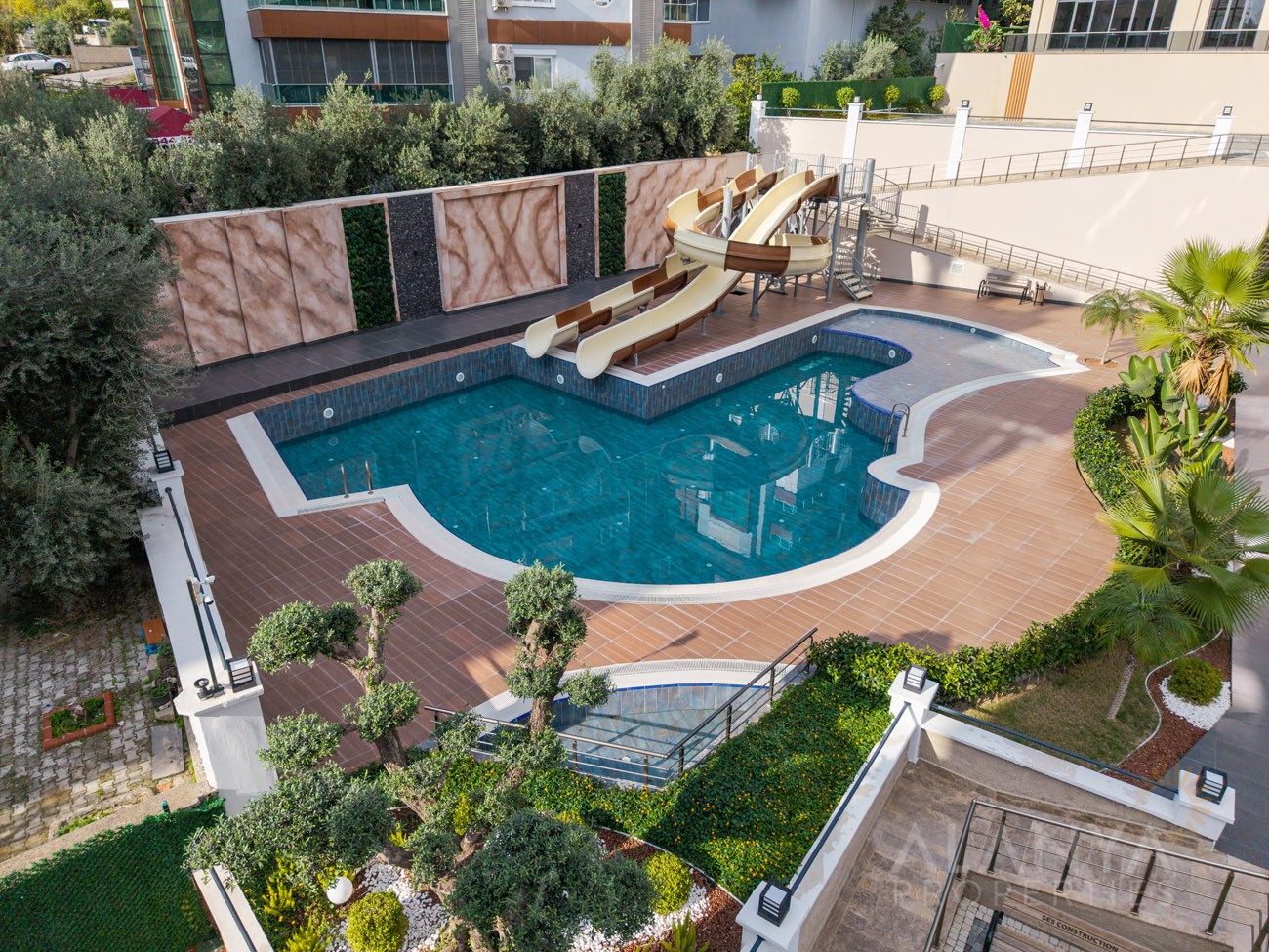 - zwembad met waterglijbanen, een kinderbad, een fitnessruimte en een activiteiten- en speelruimte